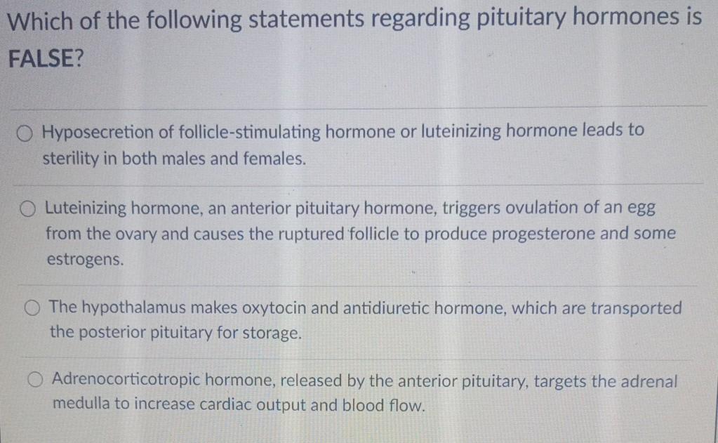 Which of the following statements is false regarding the anterior pituitary. Anatomy and Physiology questions and answers. Which of the following statements regarding pituitary hormones is FALSE.